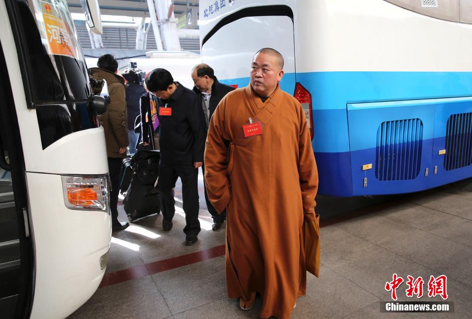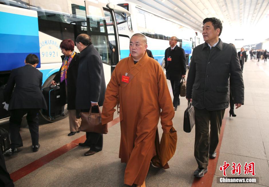 3月2日,参加十二届全国人大三次会议的河南代表团乘火车抵达北京。释永信代表随团抵达。中新社发 刘震 摄