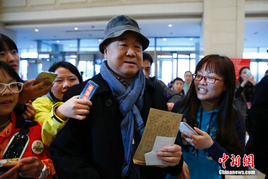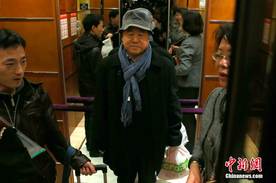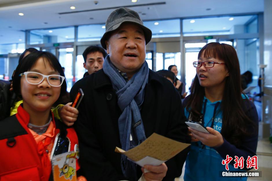 3月2日,参加全国政协十二届三次会议的委员陆续抵京报到。莫言(中)委员在北京会议中心报到。中新社发 富田 摄