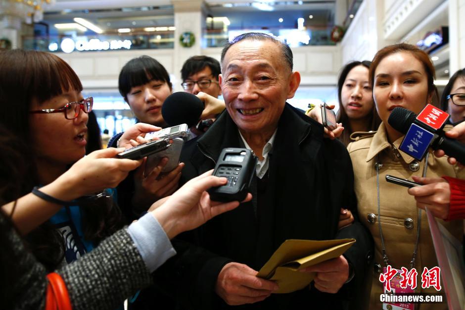 3月2日,参加全国政协十二届三次会议的委员陆续抵京报到。冯骥才(中)委员在北京会议中心报到。中新社发 富田 摄