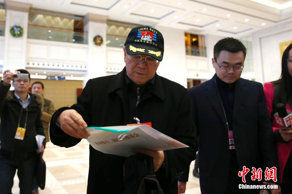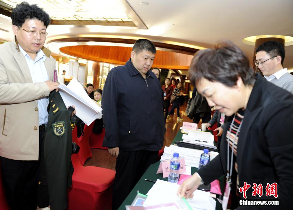 3月2日,参加全国政协十二届三次会议的委员陆续抵京报到。黄宏(中)委员在北京会议中心报到。中新社发 富田 摄