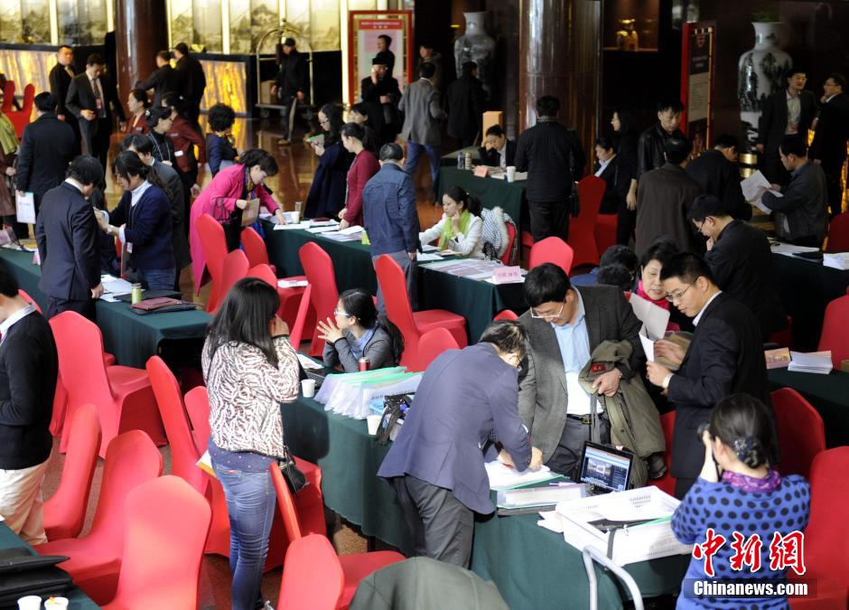 3月2日,参加全国政协十二届三次会议的委员陆续抵达驻地办理报到手续。中新社发 张斌 摄