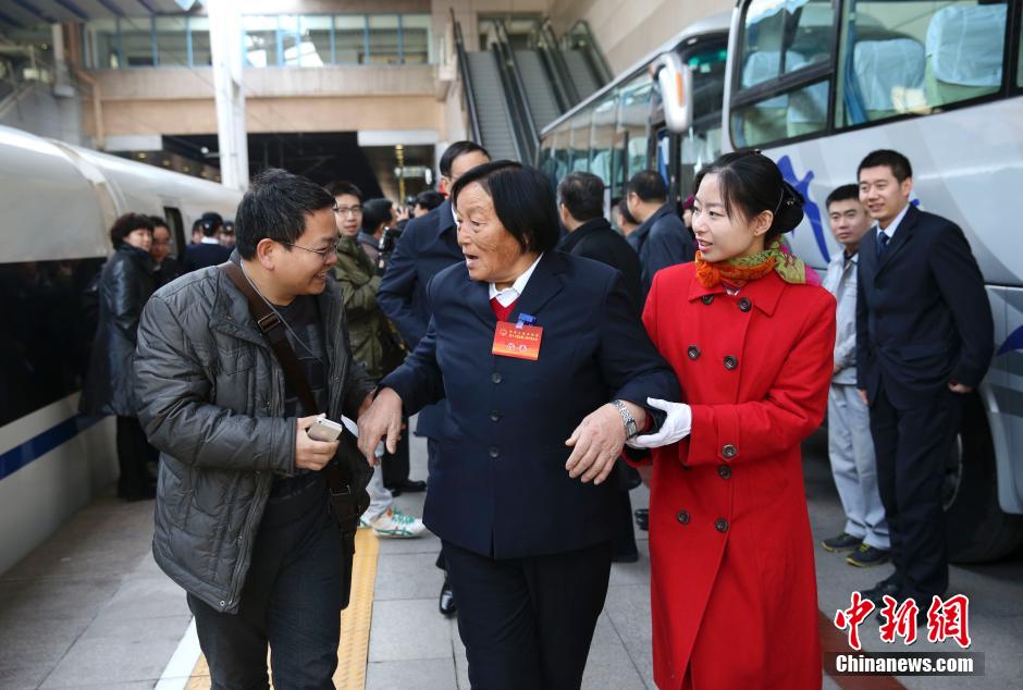 3月2日,参加十二届全国人大三次会议的山西代表团乘火车抵达北京。图为申纪兰代表抵达。中新社发 刘震 摄