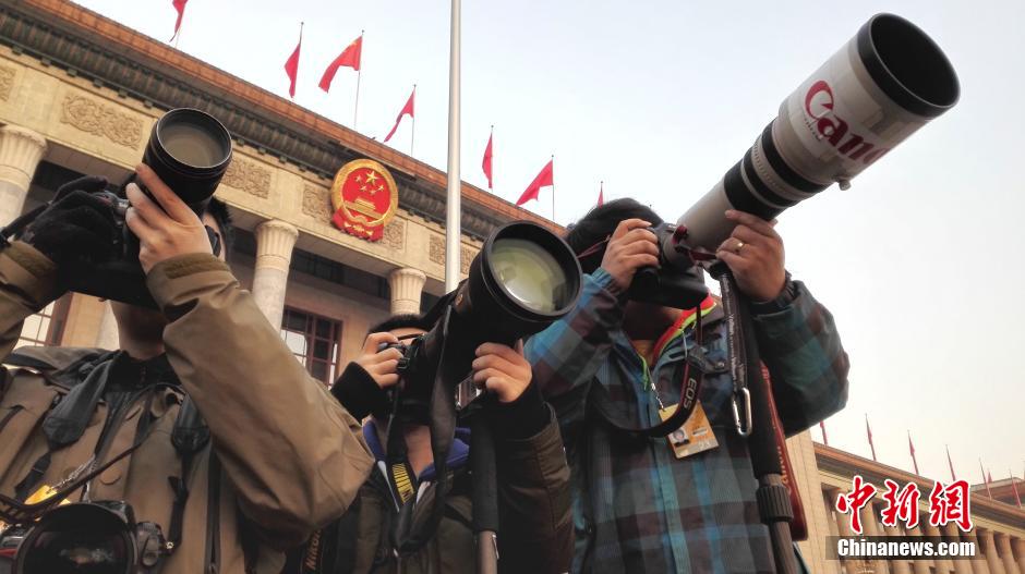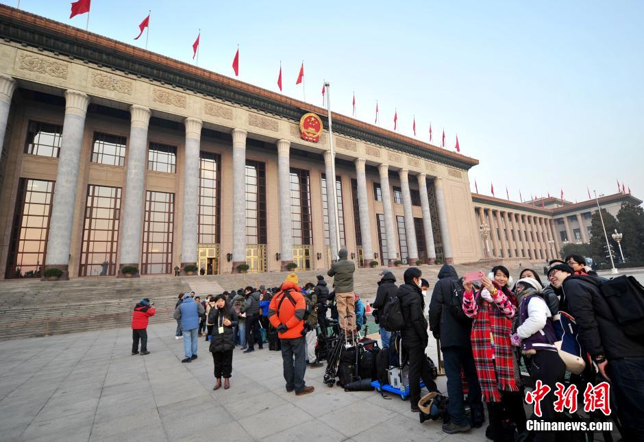 3月5日上午9时,十二届全国人大三次会议将在人民大会堂举行开幕会。图为媒体记者排队入场。中新社记者 杜洋 摄