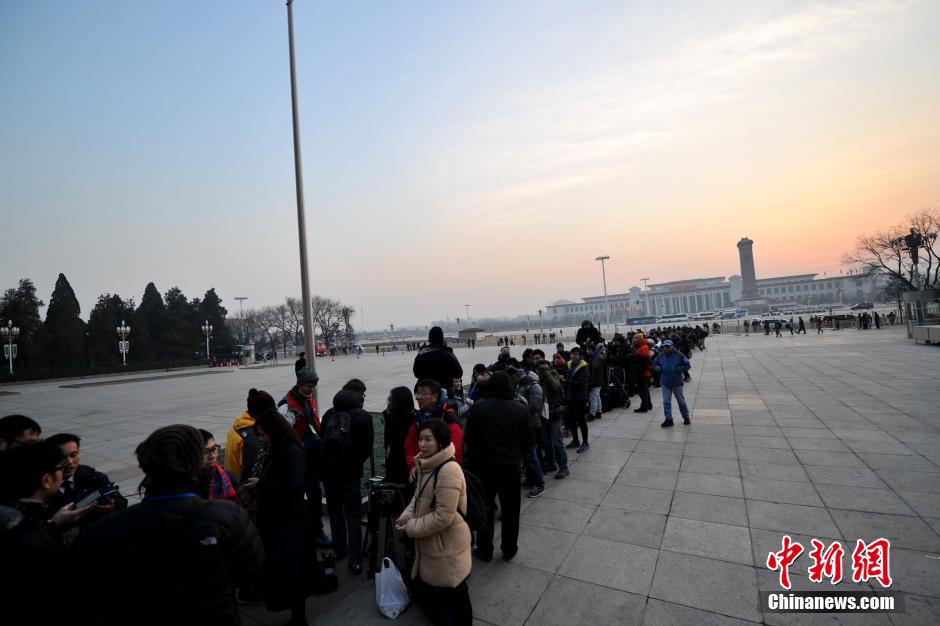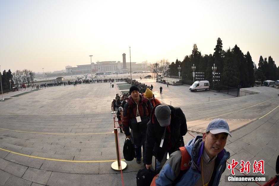 3月5日上午9时,十二届全国人大三次会议将在人民大会堂举行开幕会。图为媒体记者排队入场。中新网记者 金硕 摄