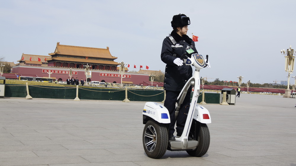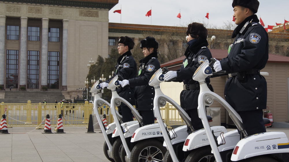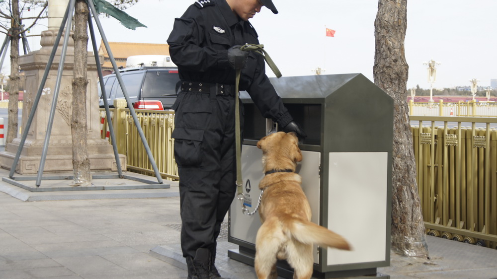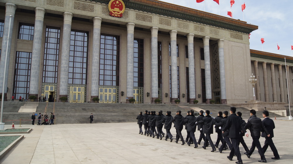 3月8日下午3时,第十二届全国人民代表大会第三次会议在人民大会堂举行第二次全体会议,听取全国人大常委会委员长张德江关于全国人民代表大会常务委员会工作的报告,听取全国人大常委会副委员长李建国关于中华人民共和国立法法修正案草案的说明。图为安保人员认真执勤。人民网记者 崔东/摄影