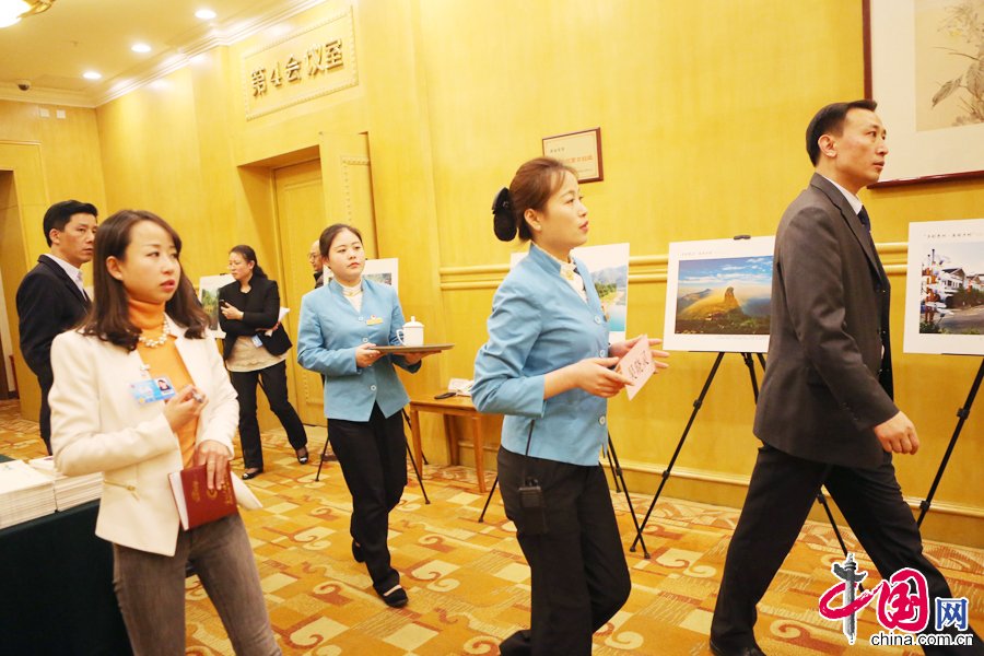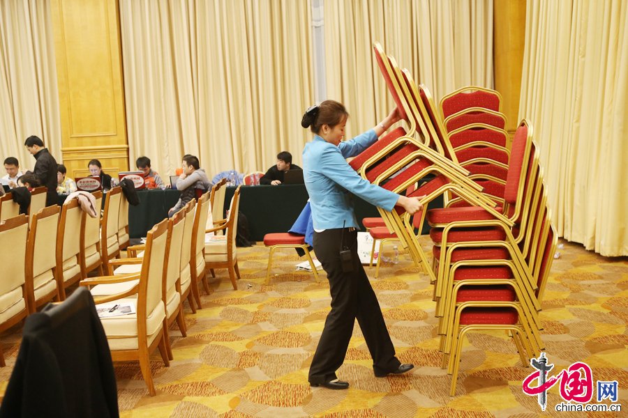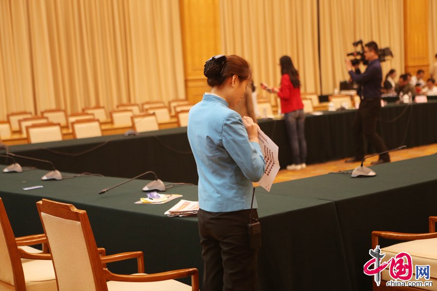 两会现场让你联想到什么?履职的代表、严肃的安保、忙碌的记者……还有呢?3月6日下午,十二届全国人大三次会议贵州团组开放日,见到孙娜的时候是下午四点,此时,她已经工作了近八个小时。据孙娜介绍,前一天她的下班时间是晚上十一点多。孙娜是国谊宾馆会议厅的业务主管,主要负责国谊宾馆20多个会议厅的服务工作。来源:中国网 董宁 摄
