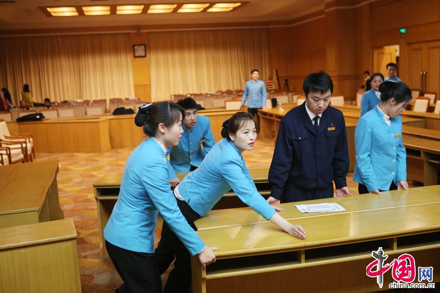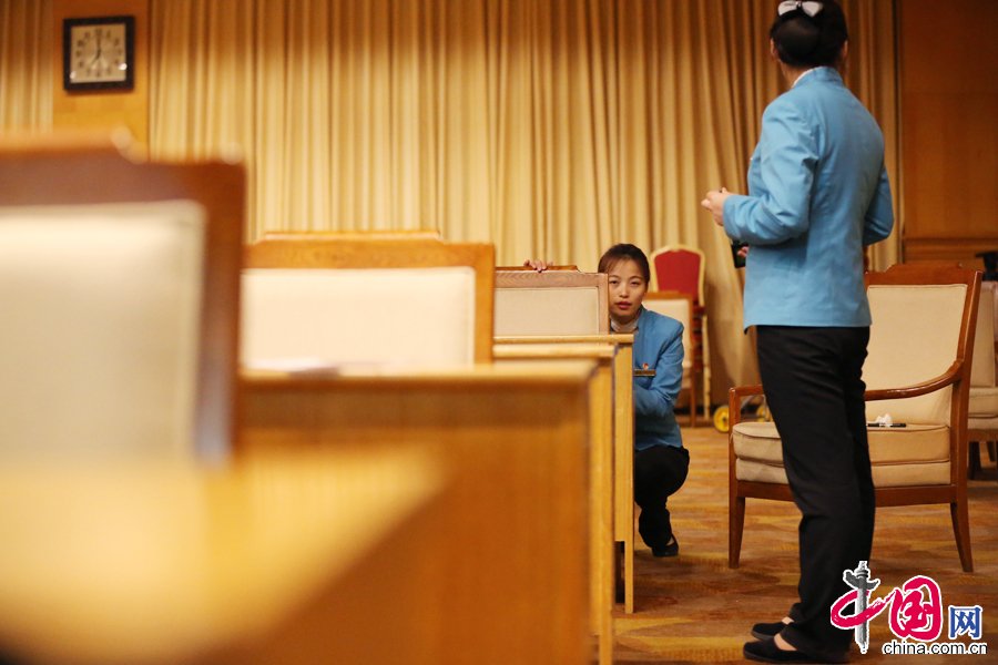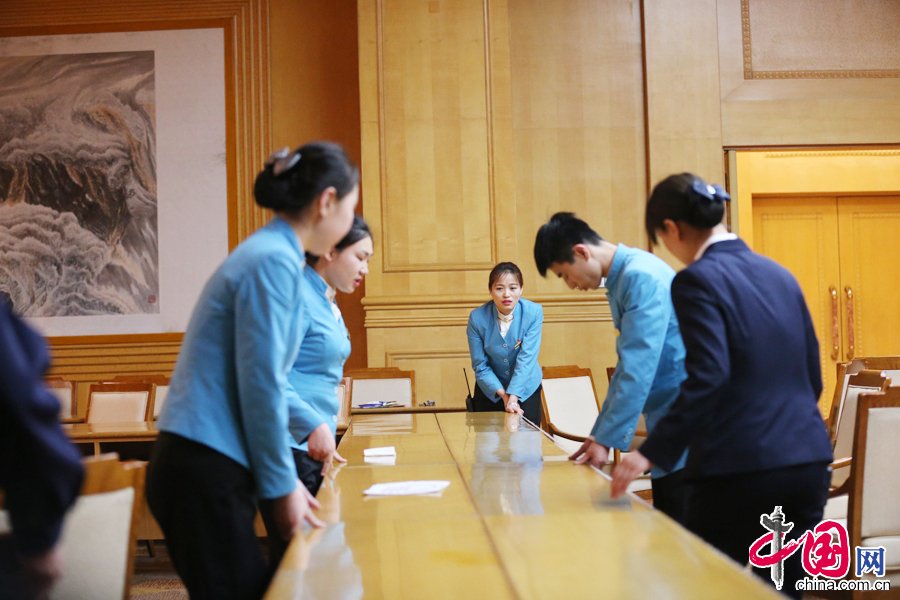 摆桌子完成后,孙娜要仔细确认桌面的平整程度。还有许多像孙娜一样的服务人员,用紧张周道的服务,协助两会期间各会议的顺利进行。