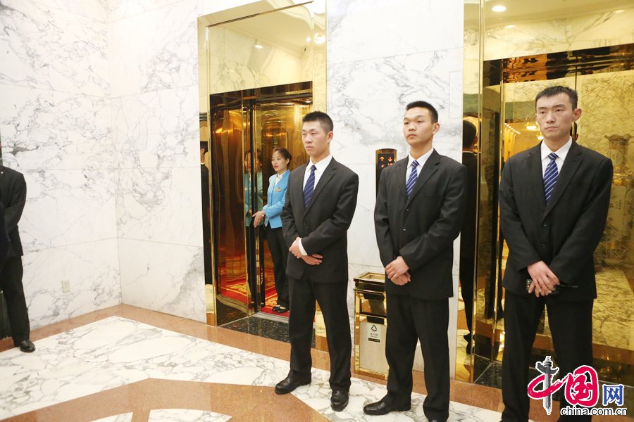 会议即将结束,孙娜提前来到电梯口,打开电梯等待代表退场,避免代表们在电梯口长时间等待。