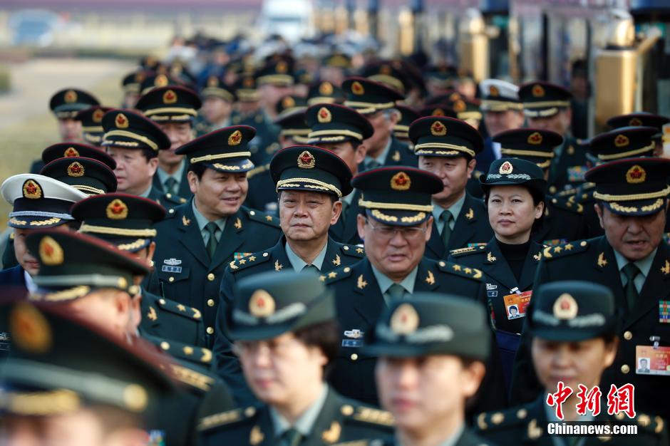 3月12日,十二届全国人大三次会议在人民大会堂举行第三次全体会议,听取最高人民法院院长周强关于最高人民法院工作的报告,听取最高人民检察院检察长曹建明关于最高人民检察院工作的报告。图为解放军代表参加会议。中新社发 盛佳鹏 摄