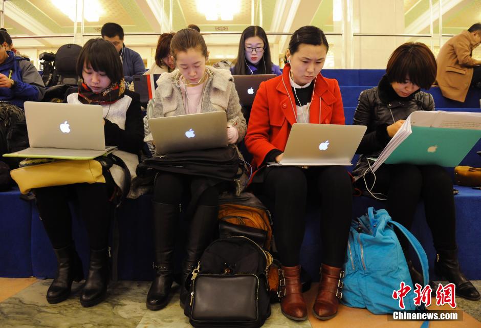 3月12日,十二届全国人大三次会议举行第三次全体会议。人民大会堂北大厅的各路记者抓紧时间发稿。中新社发 侯宇 摄