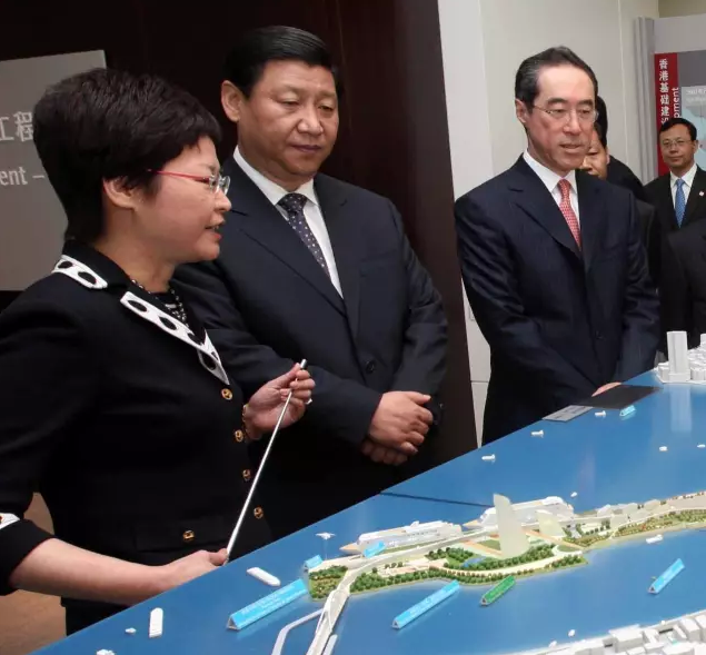 时任香港发展局局长的林郑月娥(左一)就“十大基建”项目向习近平(左二)作介绍资料图片