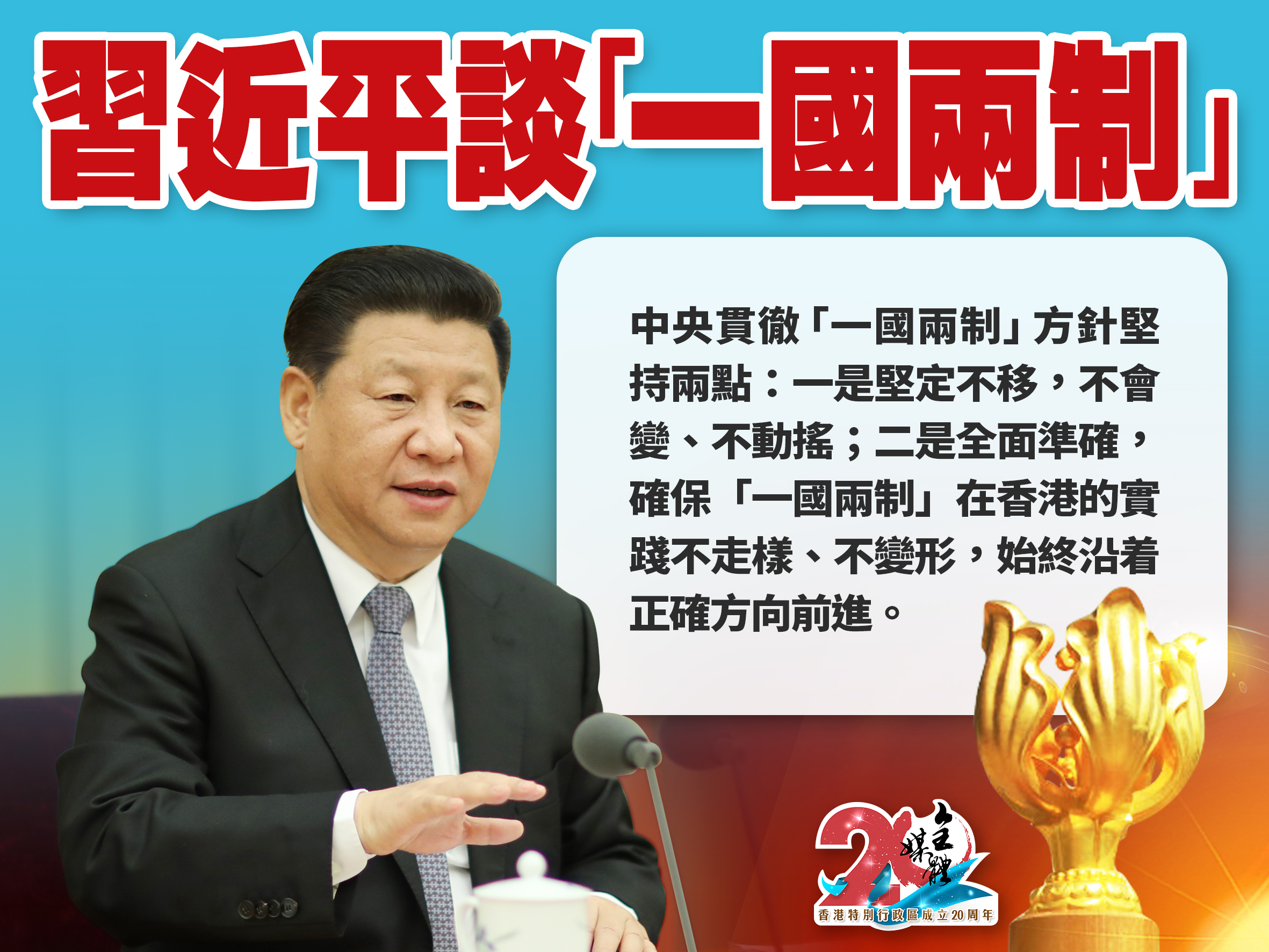 近年来,香港“一国两制”实践出现了一些新情况。我想强调的是,中央贯彻“一国两制”方针坚持两点:一是坚定不移,不会变、不动摇;二是全面准确,确保“一国两制”在香港的实践不走样、不变形,始终沿着正确方向前进。