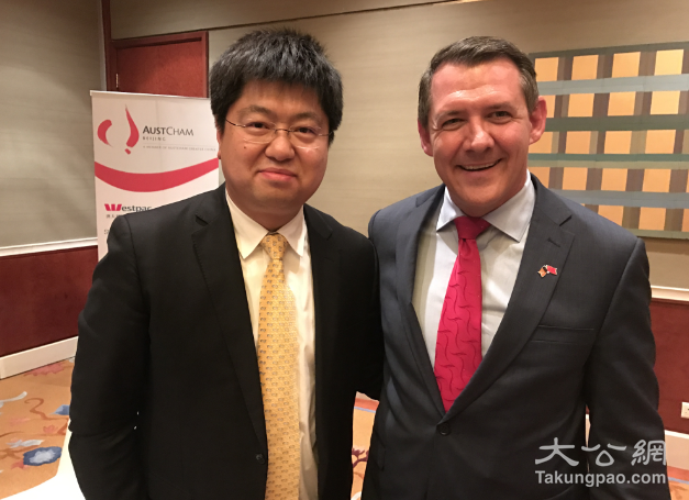北领地政府省长迈克尔·刚纳(右)与大公报社长助理、大文集团北京新闻中心总编辑、大公网执行总裁、总编辑王文韬合影。