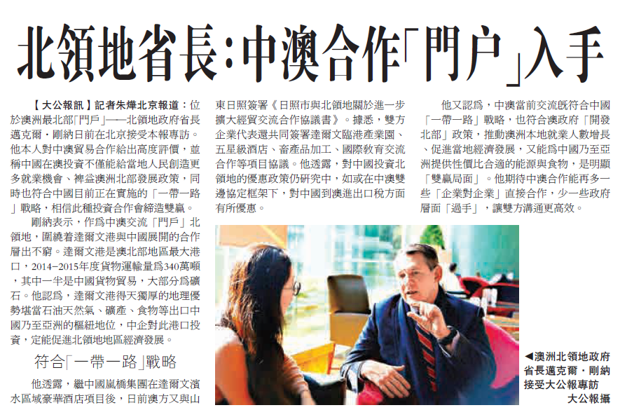 ——北领地政府省长迈克尔·刚纳日前在北京接受了本报专访。他本人对中澳之间的贸易合作给出了高度评价,并称中国在澳投资不仅能给当地人民创造更多就业机会、裨益澳大利亚北部发展政策,同时也符合中国目前正在实施的“一带一路”战略,“相信此种投资合作会给两国带来双赢局面。”