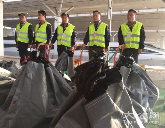 在为期10天的高铁快运服务活动中,中铁快运郑州分公司每天组织30-40人临时装卸队伍,用集装袋集装,装车后不得污染损坏车厢内设施设备。列车停稳后,装车作业人员在12分钟内完成装车作业。