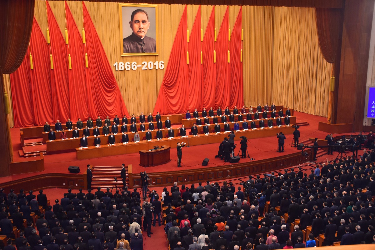 大公网北京11月11日讯(记者 张宝峰 朱烨)11日上午,纪念孙中山先生诞辰150周年大会在北京人民大会堂隆重举行。人民大会堂万人大礼堂也布置一新。主席台背景处悬挂了孙中山的巨幅画像,画像为浅底色,像中孙中山着深色中山装,画像下为白色大号字体的“1866-2016”(孙中山生卒年)。主席台背景处最上方悬挂有写着“纪念孙中山先生诞辰150周年大会”的条幅。