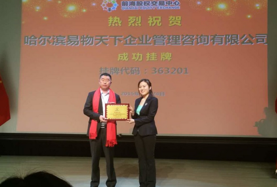 2015年11月24日下午2时许,哈尔滨易物天下企业管理咨询有限公司在深圳前海股权交易中心隆重举行挂牌仪式(企业代码:363201)