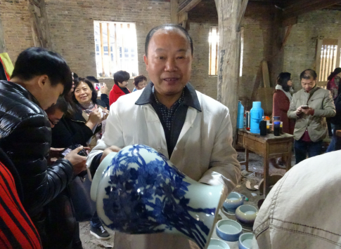 原建国瓷厂党委书记、现徐家柴窑复建复烧总指挥余喜来抱着一件刚出窑的青花瓷,笑言像抱着一个大美人。王逍摄。