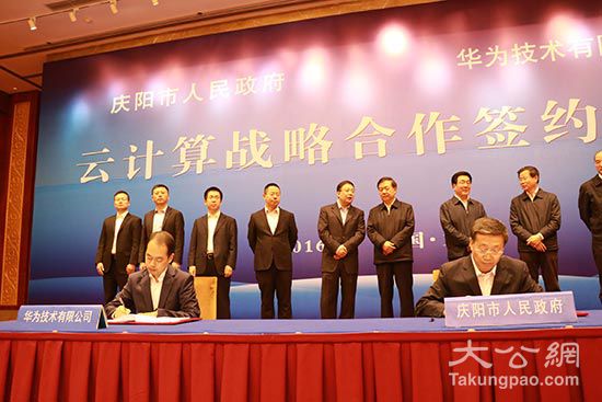 大公网兰州11月14日电(记者刘俊海)14日,甘肃省庆阳市与华为技术有限公司在兰州举行庆阳华为云计算大数据中心项目签约仪式。拟将庆阳打造成甘肃大区区域大数据处理中心、电商服务中心、现代服务业支撑中心、甘肃省信息消费中心,为“一带一路”建设提供面向全球的信息保障服务。