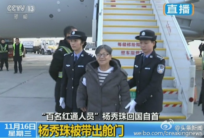大公网11月16日讯(记者 俞昼)在中央反腐败协调小组国际追逃追赃工作办公室的统筹协调下,经中央有关部门和浙江省追逃办密切协作,潜逃海外13年之久的“百名红通人员”头号嫌犯杨秀珠16日回国投案自首。这是第37名归案的“百名红通人员”。