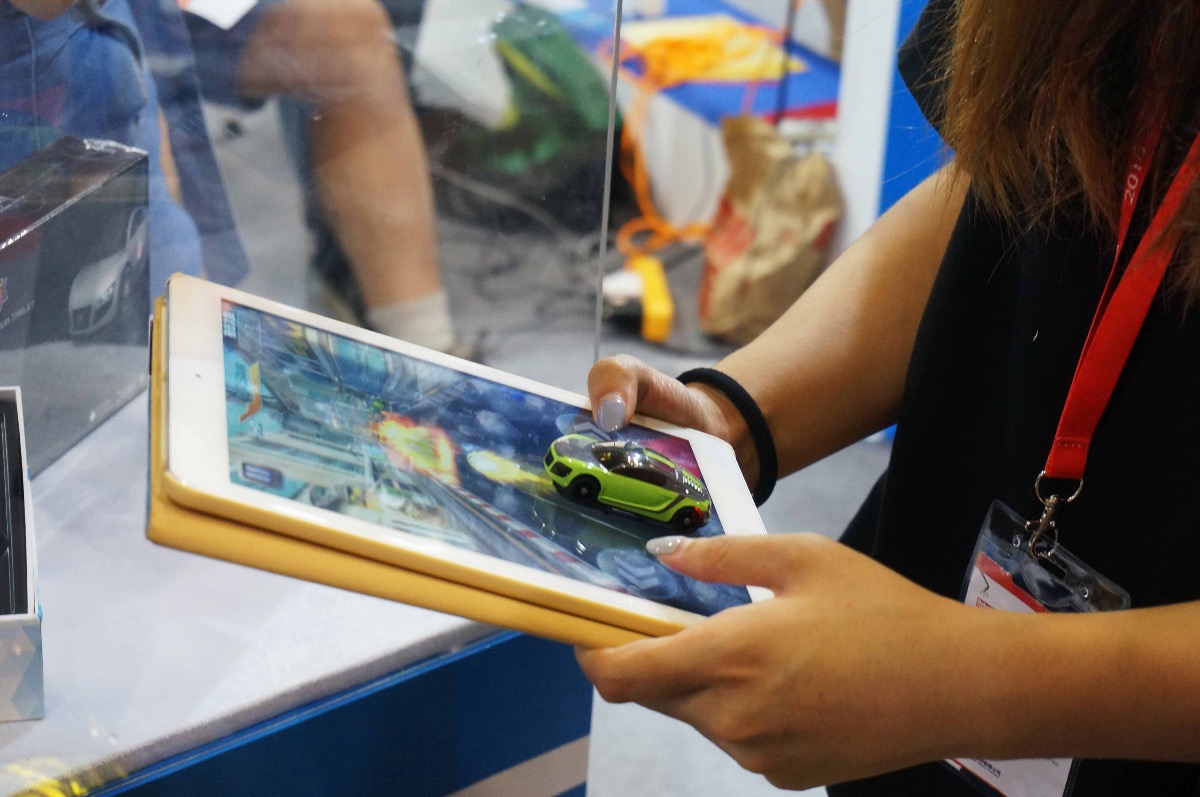 此外,展会上还展出了可搭配手机进行AR游戏的玩具汽车、按比例缩小的战斗机飞行器、可自动追随人脸接收名片的迎宾机器人等多种多样的智能机器人产品,让采购商和观众眼前一亮。