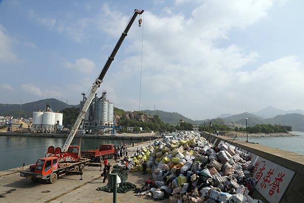 深圳海关正在对垃圾服装装车运往垃圾发电厂。深圳海关提供