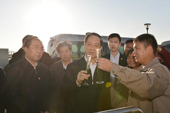 13日下午,韩启德一行在前进村污水处理厂考察。似乎是为了验证效果,韩启德喝了喝量杯中的清水。