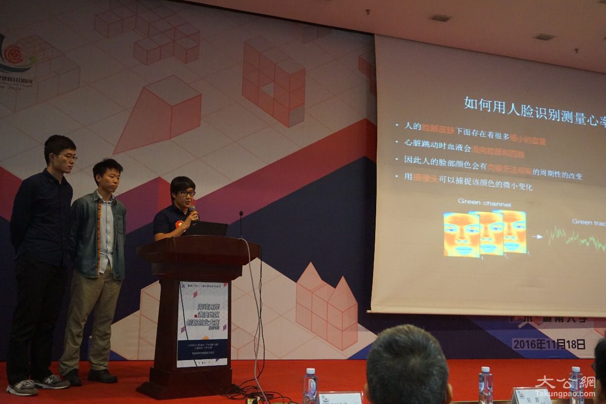 香港中文大学机器人与智能感知实验室的卢博文、李昕彤、王建坤团队的“基于人脸识别的连续血压控制”项目,夺得最佳创新奖。据他们介绍,该系统能够通过移动终端,能够远程实时进行人脸识别及脸部追踪,并从特征点讯息抽取讯号,测量人的血压和心率。