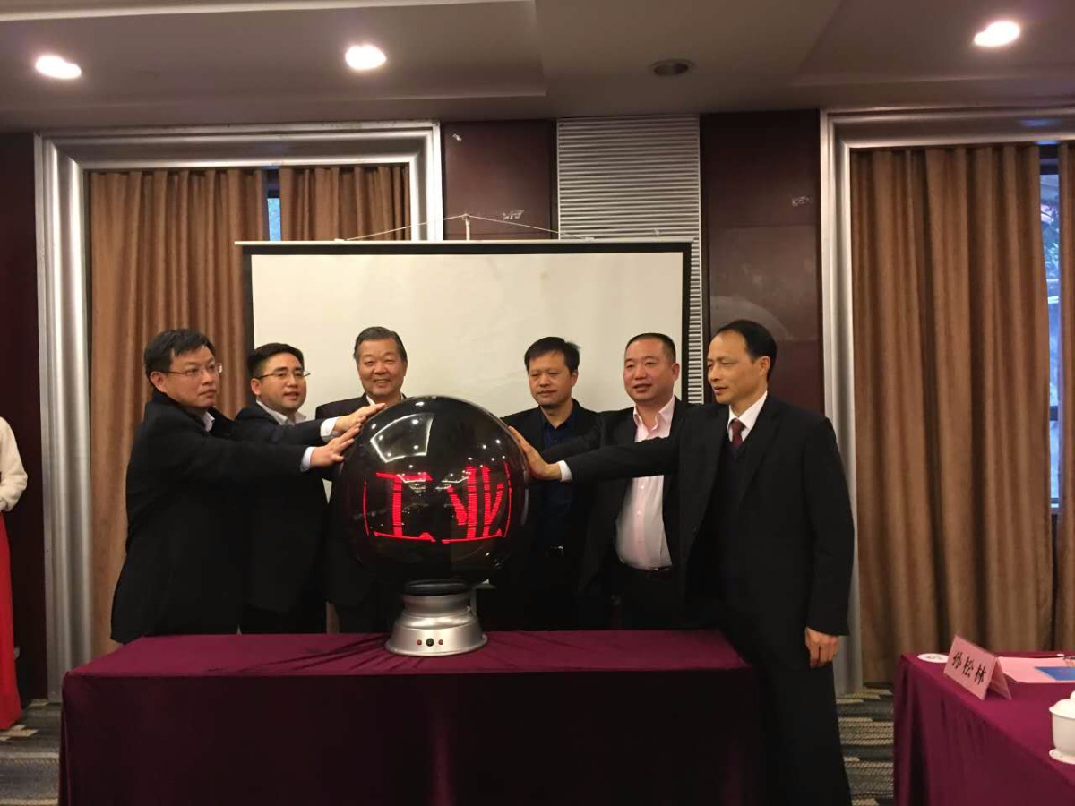 香港新闻联合会会长张国良(中左)与石首市委书记刘忠诚(中右)、石首市长石必成(左二)等触控水晶球启动香港达宝(石首)昆山工业园区。