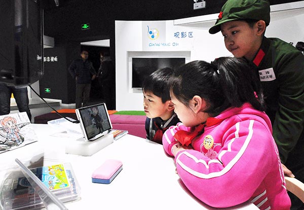 昨日,近百名小学生和小小志愿者在体验馆内共同参加了首次“儿童体验馆”的体验活动。图为,小观众在观影区观看抗战故事。