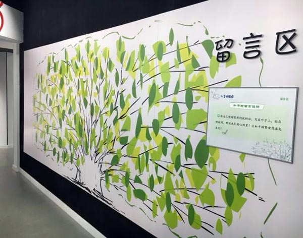 馆内“留言区的墙底为象征和平的珙桐树,小观众可将心中感受在便签上写下,粘贴在和平树枝干间,让期许和平的心愿成为和平树的一部分。