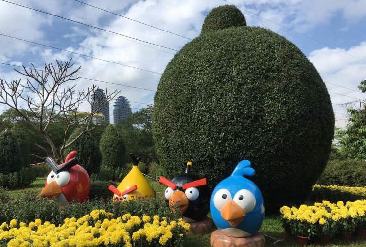 该菊花展分两个主展区,杜鹃园展区、阳光草坪展区。其中,在杜鹃园入口草地上主办方还设计了一组“愤怒的小鸟”卡通造型,意图以生动活泼地小鸟形象增加本次展览趣味性。入园造型之外,杜鹃园的品种展区此次还展示出独头菊、多头菊、盆景菊等琳琅满目的菊花品种,更有花中的艺术品,苍劲的盆景菊及迷你造型菊令爱菊者大饱眼福。
