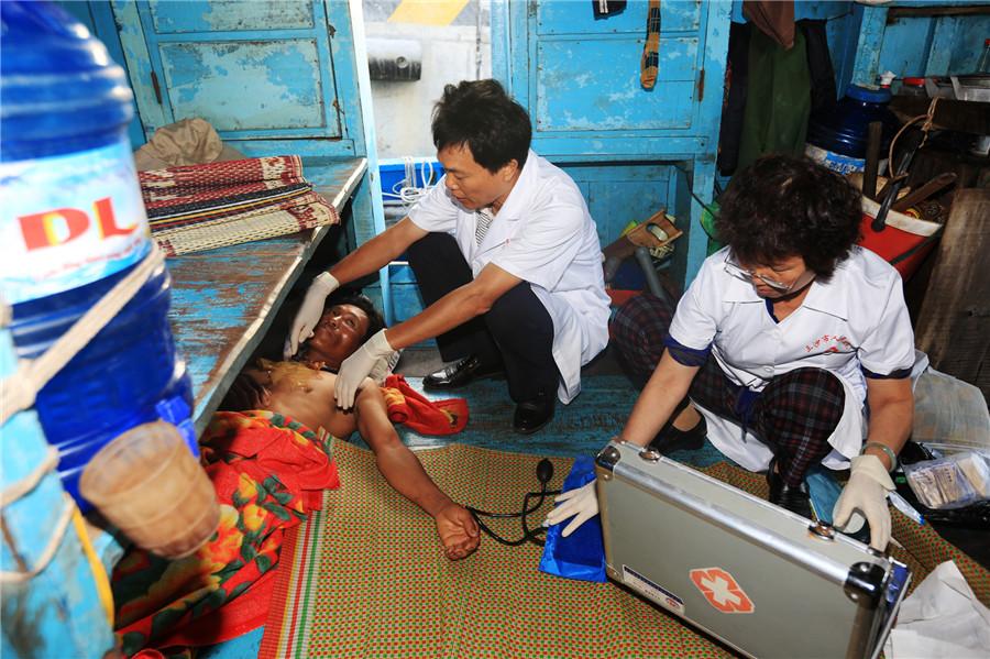 2013 年 12 月 ,一艘外籍渔船在中国周边海域非法捕鱼,一名渔民在潜水作业时,不小心被螺旋桨击中,左胸口被划开一个大口子,顿时血流不止,由于船上缺医少药,加之海上伤口极易感染,有可能危及生命,无奈之下,只能向中方救助。接到求助信号后,包括民兵连在内的三沙相关单位立即积极投入救援中。