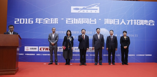 大公网11月26日讯 (记者 曹晓晨)由欧美同学会主办的2016年全球“百城同台”海归人才招聘会26日在北京举行。全国人大常委会副委员长陈竺宣布招聘会开幕并现场与海外分会场留学人员进行视频对话,中央统战部副部长戴均良出席并致辞。