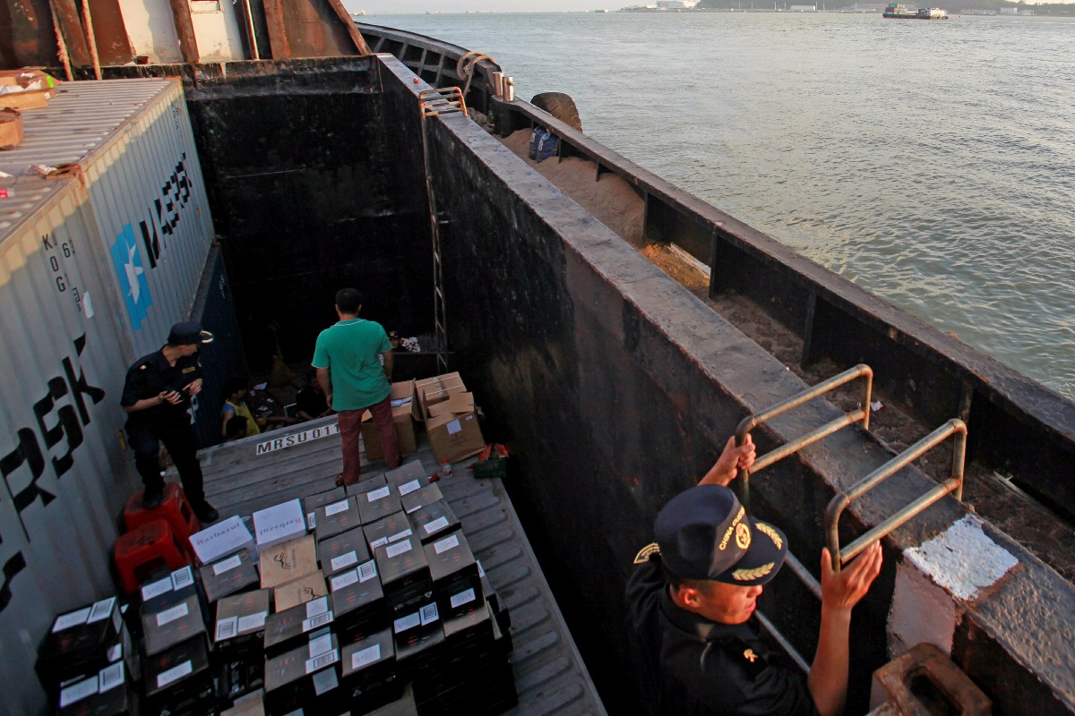 近期,广州海关成功在珠江口堵截一条混在合法经营船流中的走私船,堆积如山的集装箱中,执法人员切割开被遮掩的暗舱铁板,大量的进口红酒、奶粉、通讯电源一览无遗。同时,暗格内藏有大量的刀具、气枪、军用弩等,多达180多把。该团伙明目张胆地走私刀、枪、弩等禁止进境的管制物品,令执法人员大为吃惊。