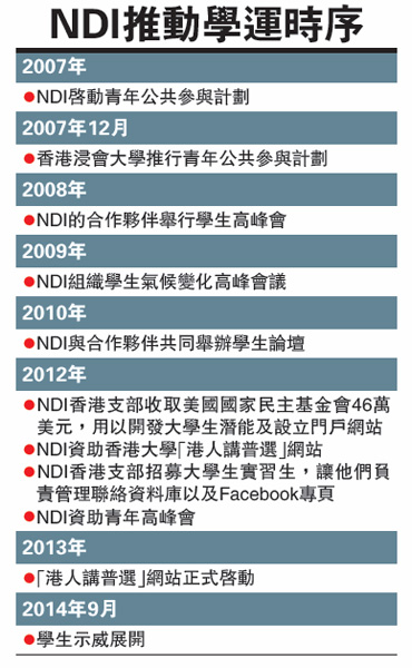 2014年11月占领行动势同水火之时就有报告披露NDI透过在港进行青年公共参与计划,密谋“占中”已长达八年。
