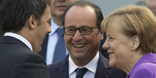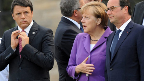 (意大利总理伦齐、德国总理默克尔、法国总统奥朗德)听说,卡梅伦决定英国加入亚投行了,我们怎么办?