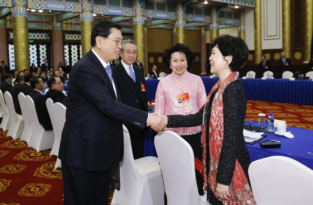 图:中共中央政治局常委、全国人大常委会委员长张德江在北京参加全国政协十二届三次会议港澳委员联组会议\中新社