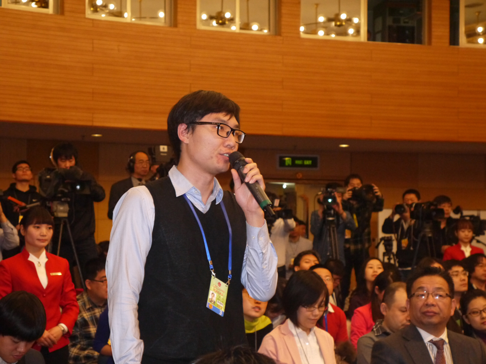 图:大公报记者贾磊在记者会上向全国政协常委朱维群提问/大公报记者江哲摄
