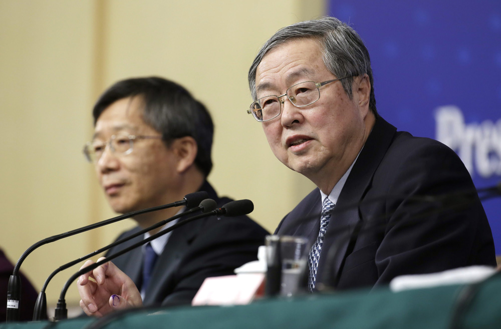 图:12日,全国人大举行记者会,邀请人行行长周小川、国家外汇管理局局长易纲等回答记者提问。这是周小川(右)和易纲在记者会上/路透社