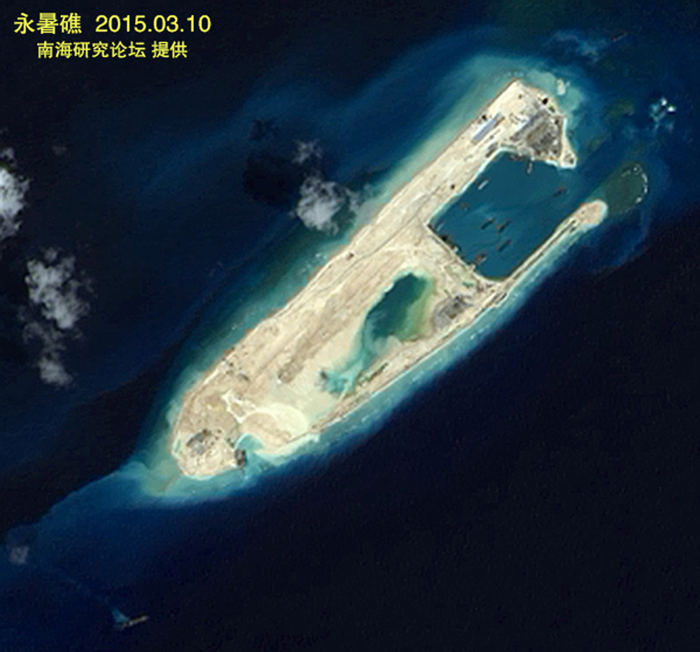 【大公报讯】据观察者消息:3月10日拍摄的卫星图片显示,中国在南沙多个岛礁的填海建设工程仍在继续。在目前南沙面积最大的永暑礁上,主礁盘已经基本填满,面积已达大约2.2平方公里,礁盘上的内湖也正在迅速缩小,与此同时,礁盘东北角出现了笔直的灰色色带,似乎证明岛上机场的跑道铺设工作已经开始。