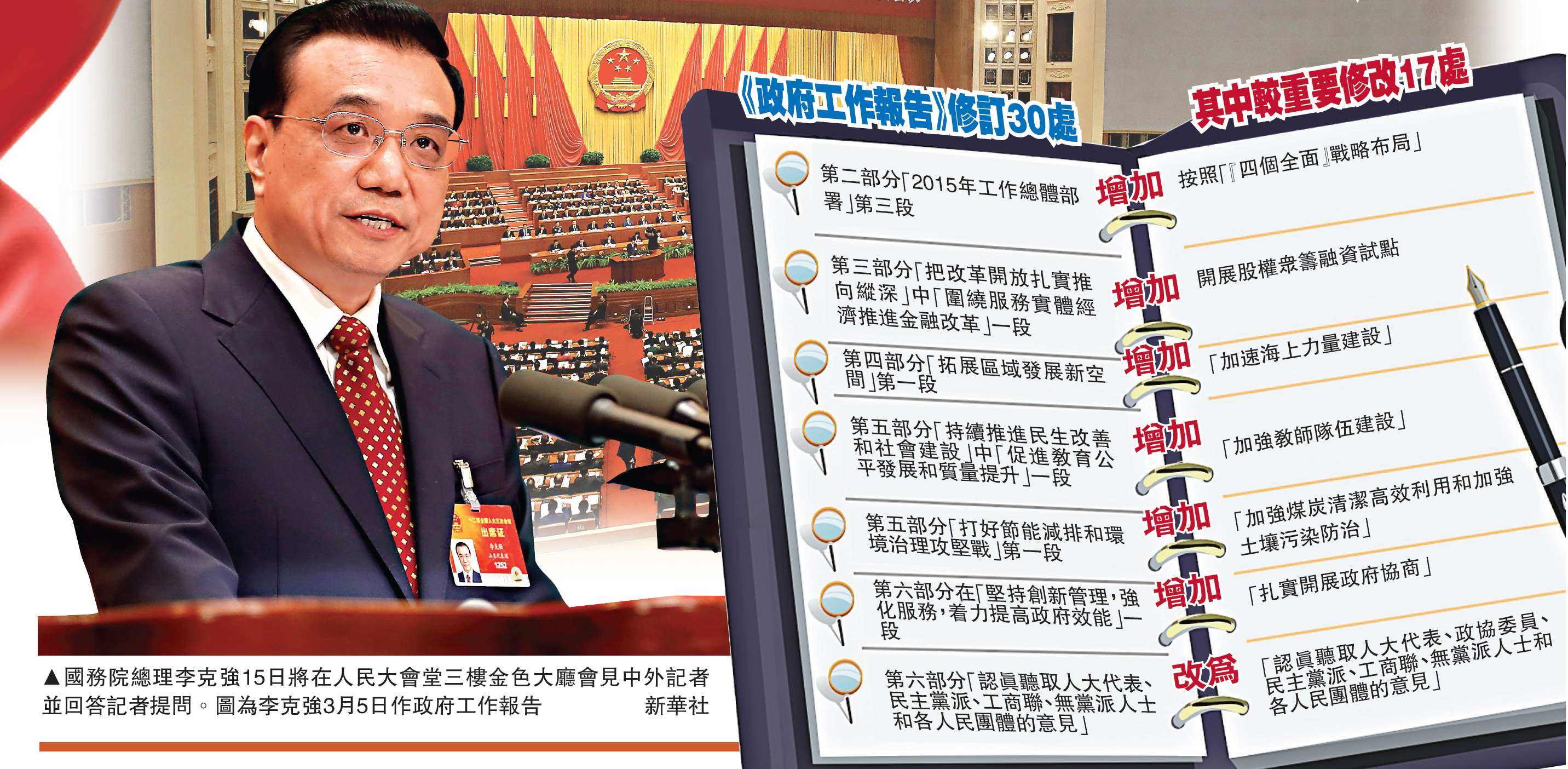 根据人大代表审议和政协委员讨论提出的意见和建议,国务院对《政府工作报告》(下称《报告》)进行了反覆推敲,共作出修改与补充30处,其中比较重要的修改17处。“开展股权众筹融资试点”、“加强海上力量建设”等内容写入报告。【大公报记者贾磊北京十四日电】
