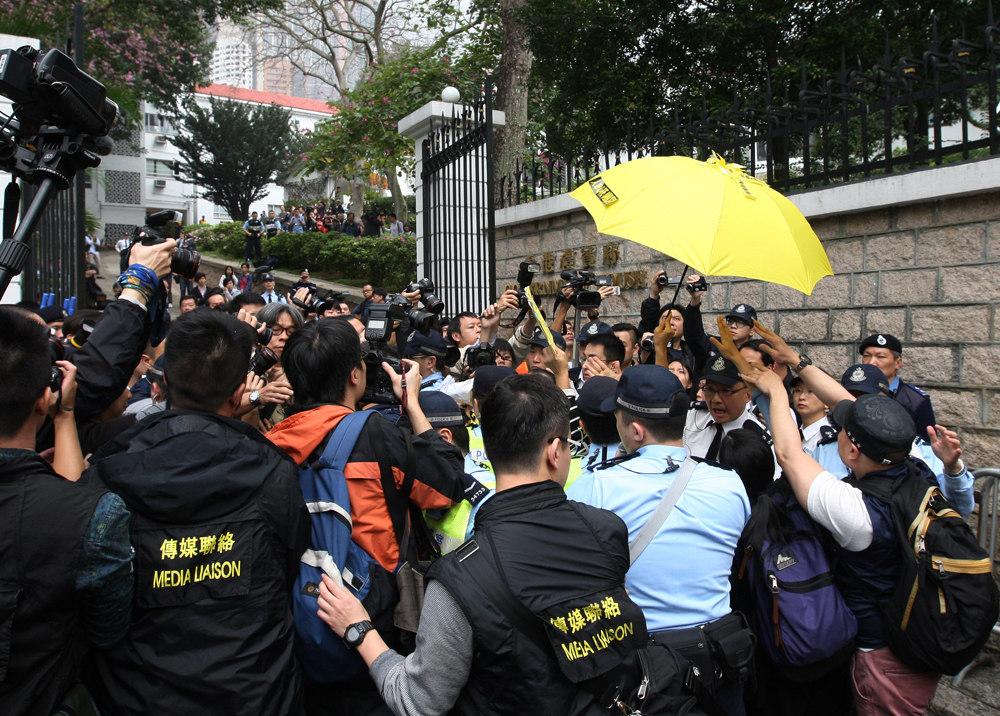 图:激进分子挥舞黄伞企图强闯礼宾府,被警方成功阻截/本报记者林少权摄