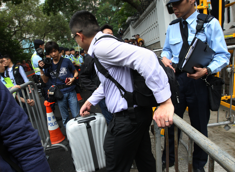 本土派成员拖箧入场滋事,遭警员制止/本报记者林少权摄