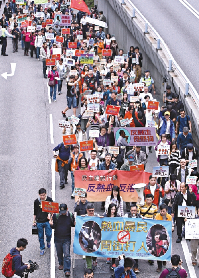 “德德悟政经”、“民主建设行动”、“佔中不代表我”及“我要真普洱行动”昨日发起“反热血反港独”大游行,谴责示威人士製造事端、暴力冲击,并促请警方和法庭严正执法。大会以“一齐食热狗”作为起步仪式,游行人士食下100个热狗,寓意声讨俗称“热狗”的激进团体“热血公民”。约二百名市民从中环遮打花园游行至政府总部,并在添马公园举行集会,期间游行人士高叫口号,举起“热血暴民,周街打人”、“人神共愤”、“还我治安”等标语,表达对近日反水货客示威中出现的暴力、鼓吹“港独”等行为的不满。