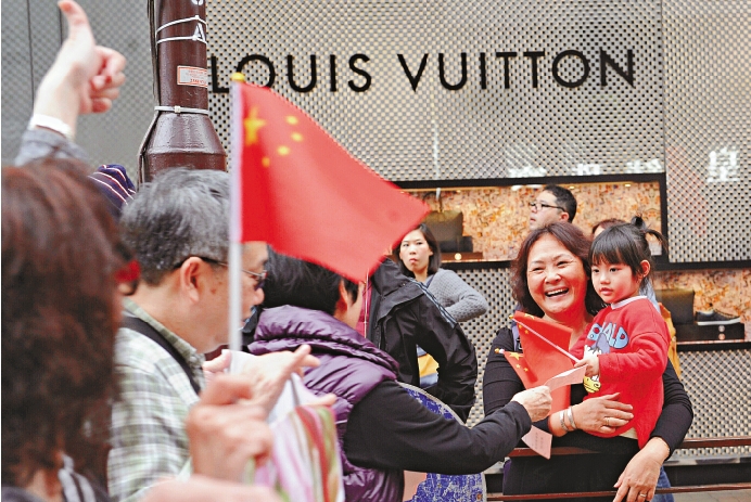 图:七个团体在广东道游行,沿途向游客派发单张,宣传香港欢迎你/中通社