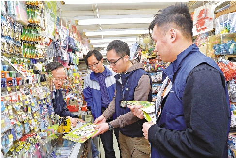 图:为协助地区零售商户了解胶袋收费的详情,环保署安排人员陆续到各区零售店舖,向商户派发宣传物品介绍法例要求