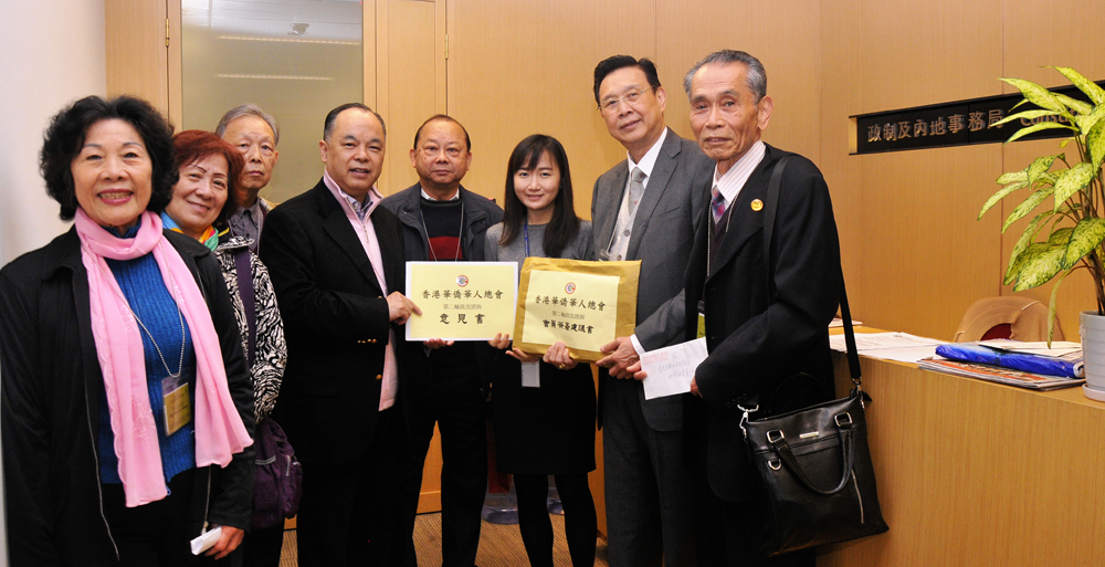 图:香港侨总主席梁淦基(右二)等负责人前往政府总部递交第二轮政改意见书和会员签署政改谘询建议信,并对特区政府政改工作表示支持,表达敬意