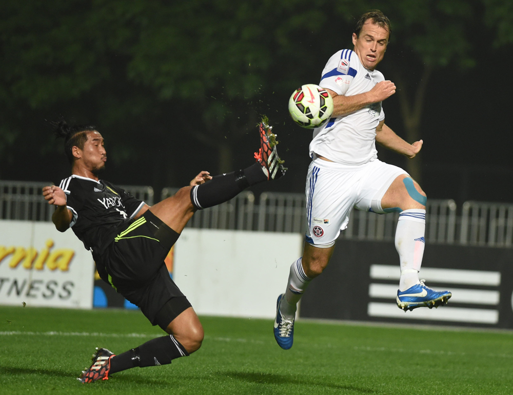 图:太阳飞马的苏伟泉(左)快东方球员麦阿里士打一步,大脚解围/本报摄