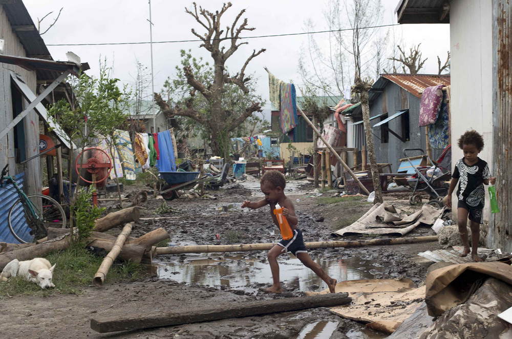 图:风暴过后,瓦努阿图小童在泥地上跳来跳去/路透社